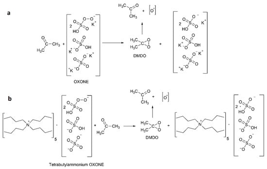 The mechanism of activity of OXONE and TBA-OXONE as disinfection agents is shown in Figure 2. In the first case (Figure 2a), the active element is the oxygen radical resulting from the decomposition of dimethyloxirane formed in situ in the reaction between OXONEs and acetone. In the second one (Figure 2b), in addition to oxygens, a strong oxidant antibacterial ammonium group is also present. For the disinfecting activity, a combination of antibacterial and oxidative properties is beneficial. During the reactions, dimethyloxirane (DMDO) was formed [,]. The low concentration (below 1%) of in situ generated DMDO is very important because the pure agent is explosive.