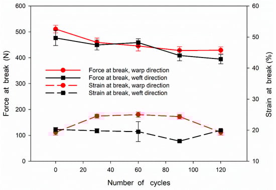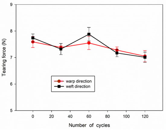 The dependence of force at break and strain at break on the number of disinfection and washing cycles of the tested fabric samples is shown in Figure 3. It can be seen that the force at break during drawing in the warp and weft direction decreased from 510 to 430 N and from 480 to 390 N, respectively, with increasing number of cycles. Thus, the decrease of the force at break did not exceed 15 and 20%, respectively. In turn, the strain at break during drawing in the warp and weft direction varied within the ranges of 19–25% and 20–16%, respectively, without a clear dependence on the number of cycles. The dependence of tearing force on the number of disinfection and washing cycles is shown in Figure 4. The tearing force showed a tendency to decrease slightly with increasing number of cycles, from 7.7–7.6 N to 7.0 N, that is by 10% after 120 cycles. It can be concluded that the disinfection and washing cycles did not significantly deteriorate the mechanical properties of the fabric. It is worth mentioning that a slight decrease in the strength of cotton fabric solely due to the antibacterial treatment was also observed by others [].