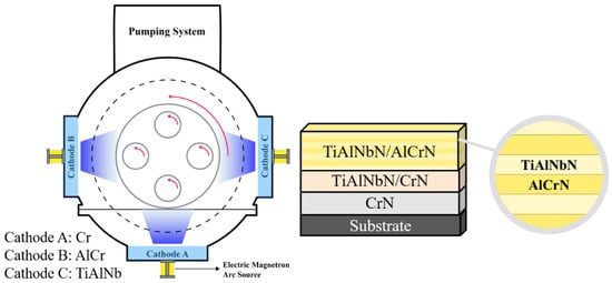 Schematic representation of the deposited TiAlNbN/AlCrN coatings using a cathodic arc system with multi-cathodes.
