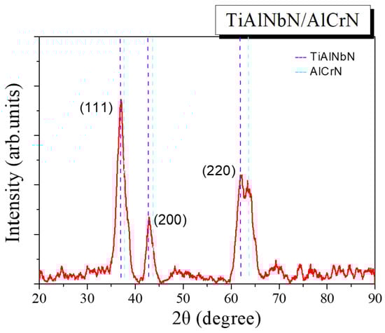 Glancing angle X-ray diffraction pattern of the deposited TiAlNbN/AlCrN coating.