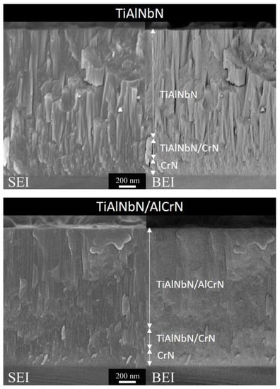 Cross-sectional SEM micrographs of the deposited TiAlNbN and multilayered TiAlNbN/AlCrN coatings showing secondary electron images (SEI) and backscattered electron images (BEI).