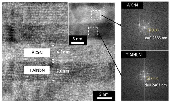 Figure 5 shows the high magnification cross-sectional HRTEM micrograph of the top TiAlNbN/AlCrN coating and corresponding fast Fourier transform (FFT) images of each AlCrN and TiAlNbN layers. Similar to the results of XRD, hexagonal wurtzite-type AlN phases were not detected in the TiAlNbN/AlCrN. Although the multilayer coating exhibited a slightly higher percentage of Al than Ti, the coating was far from the possible spinodal decomposition and formation of hexagonal phases of AlN []. The TiAlNbN/AlCrN exhibited columnar growth multilayer structure with dark and bright layers alternating in growth direction. Using the different cathodic arc sources (AlCr and TiAlNb), the multilayer structures were formed by alternate deposition of each TiAlNbN and AlCrN. AlCrN. The dark layer was TiAlNbN and the bright layer was AlCrN, respectively. The layer thicknesses of the TiAlNbN and AlCrN were 7 nm and 6.2 nm, respectively. The periodic thickness of the TiAlNbN/AlCrN was 13.2 nm. The periodic thickness in nanoscale is the most important parameters in multilayer hard coatings. The enhancement of mechanical properties generally occurs in a narrow range of 5–15 nm due to dislocation blocking by layer interfaces and strain effects at layer interfaces [,].