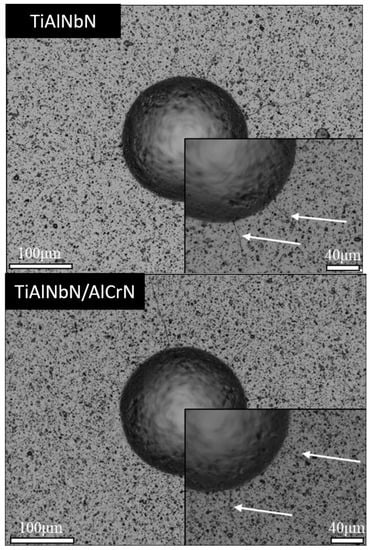 - TiAlNbN and multilayered TiAlNbN/AlCrN were deposited as the top layers. For the deposition of multilayered TiAlNbN/AlCrN, the samples were mounted on a rotational holder to undergo a two-fold rotation at a rotation speed of 4 rpm. All coatings were synthesized in N2 at a total pressure of 2.7 Pa and a bias voltage of −80 V. The total thickness was ~2 µm by controlling the cathode current of 80 A and deposition time of 50 min.