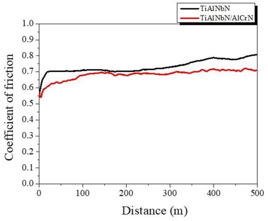 The coefficient of friction of the deposited TiAlNbN and multilayered TiAlNbN/AlCrN coatings on cemented carbide (WC- 8 wt.% Co) samples against cemented carbide balls as a function of sliding distance in the dry environment.