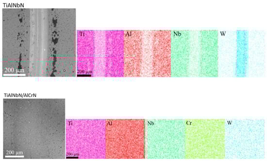 Due to testing against hard WC-Co balls, abrasion was the predominant wear mechanism. Hard WC asperities penetrated into the coatings that resulted in their scratching and chipping. The wear track SEM images of the TiAlNbN and multilayer TiAlNbN/AlCrN coatings as well as EDS elemental mapping are shown in Figure 8. For the multilayer TiAlNbN/AlCrN coating, the middle band of the wear surface on the wear track was clean and smooth. The EDS mapping at the wear track area of the TiAlNbN showed distinct enrichment of W, which exhibited coating delamination, indicated by the exposure of the WC-Co substrate. The hard wear debris acted as an abrasive increasing the wear rate. In contrast, the TiAlNbN/AlCrN with higher H, H/E and H3/E2 ratios did not exhibit delamination that confirmed the stronger bonding between the layers resulted in the better wear resistance. Our previous study also showed that multilayer AlTiN/CrN/ZrN coatings with CrN layer addition could possess good wear performance due to the multilayer architecture with CrN addition that effectively released the internal stress to resist abrasion wear []. Y.X. Ou et al. [] also showed that a multilayer Si3N4/CrN coating had high hardness and toughness using CrN introduction, and possessed cracking resistance to improve wear resistance. In this study, the results showed that the multilayer TiAlNbN/AlCrN coating with AlCrN addition into TiAlNbN possessed good wear resistance due to high resistance to plastic deformation that scaled with H3/E2 ratio. This reduced the probability of initiated cracks on the wear surface. The dense columnar TiAlNbN/AlCrN multilayers were thought to enhance the mechanical properties and wear performance. Given the wide range of materials and methods used to fabricate hard coatings for tribological applications, by selecting the proper combination of materials and design strategy, multilayer coatings, such as the TiAlNbN/AlCrN in this study, can be adapted to reduce friction and increase wear resistance of mechanical components in a variety of tribological applications [].