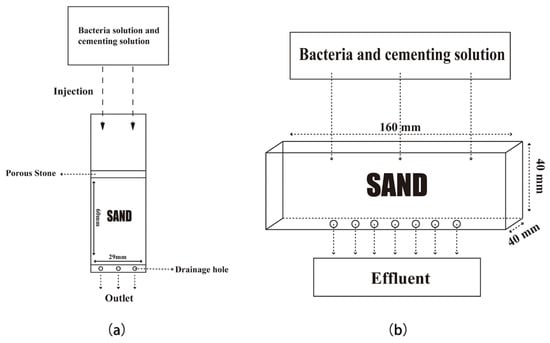 In addition, a plastic cuboid model at a size of 40 × 40 × 160 mm was utilized to fill with sand for mechanical monitoring and permeability testing [14], as shown in Figure 2b. The pore volume of 70 ± 0.5 mL for sands filled in this mold was determined by the water saturation-weight method. Then, 460 ± 0.01 g sands were loaded into the mold for subsequent MICP treatment. Similar to the above treatment, 70 mL of bacterial liquid was injected into the mold, and the cementing liquid (composed of 1M urea and 1M CaCl2 and pH was adjusted to 8 by 1 g/L of tris-based solution) was injected after 8 h. Then, all the specimens were placed under 30 °C and taken for mechanical tests, calcite content tests, and permeability tests at different time periods.