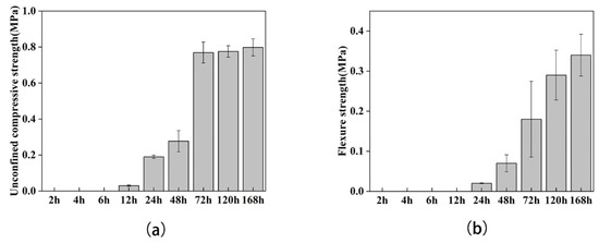The samples (40 × 40 × 160 mm) at each observation time point were selected to conduct mechanical experiments to explore the effects on the mechanical properties of the samples during the formation and development of calcium carbonate. The results showed that the flexural and compressive strengths of the samples increased with time and both reached their peaks on the seventh day. In the first six hours, the sand columns were still in a state of loose sand, and the corresponding mechanical performances could not be tested. The compressive strength was obtained at the 12th hour; however, the flexural strength was obtained at the 24th hour before the toughness was too low to be detected by the machine. We found that at 72 h, the mechanical properties of both were greatly improved, among which the compressive strength was increased by 2.78 times compared with the previous time point, and the flexure strength was increased by 2.57 times (Figure 5a,b). It is worth noting that this time period was the node where rhombohedral calcite appeared. In general, the flexural strength showed a step-by-step increasing trend, while the increase in compressive strength tended to moderate after the 72nd hour. The flexural strength varied greatly among the samples, while the compressive strength varied less among the samples.