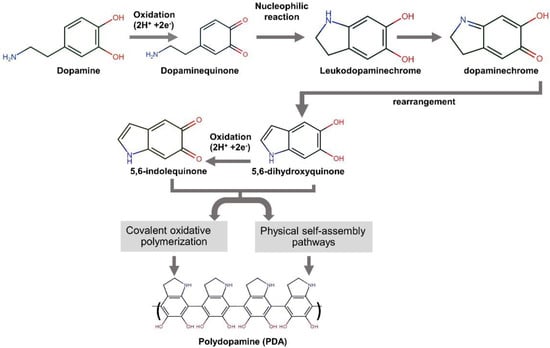 The mussel-inspired polydopamine (PDA), which contains catechol, amine, and imine functional groups, has been recommended as an organic platform to immobilize bioactive molecules or ions onto various types of surfaces []. This strong and reliable PDA thin film on the surface substrate is generated through base-triggered oxidation and dopamine self-polymerization during the material’s soaking in dopamine solution []. Figure 1 exhibits the mechanism of PDA formation from the aqueous dopamine solution. It is commonly accepted that the intermediate indoles, 5,6-hydroxyindole and 5,6-indolequinone, play a significant role in the formation of the dopamine-based polydopamine. The PDA structure has heterogeneity. It comprises oligomers of covalently bonded dimers and higher oligomers of 5,6-hydroxyindole and 5,6-indolequinone held by charge transfer and hydrogen bonding [].