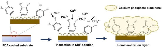 The formation of the CaP biomineralized layer on the PDA-modified surface is initiated by the deposition of calcium (Ca2+) and phosphate (PO43−) ions on the PDA-coated surface through the accelerating effect of the surface negative charge induced by the catechol and amine functional groups on the PDA layer. The progression of the layer-by-layer deposition of Ca2+ and PO43− ions on the PDA-modified surface results in the formation of the CaP biomineralized layer, covering the surface of the substrate [,,]. A schematic of the biomineralization process is provided in Figure 2.