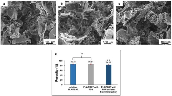 The scanning electron microscope (SEM) images of the pristine PLA/PBAT scaffolds (a), the PLA/PBAT scaffold with PDA surface modification (b), and the PLA/PBAT scaffold with PDA-assisted biomineralization (c). The percentage of porosity of the scaffold measured by the gravimetric method (d). The difference in number of asterisks represents statistical significance (p ≤ 0.05).