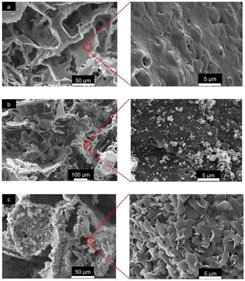 The overall morphological features of the pristine PLA/PBAT, PLA/PBAT coated with PDA, and PLA/PBAT with PDA-assisted biomineralization are presented in Figure 4. The SEM images of the pristine PLA/PBAT scaffold (Figure 4a) revealed the formation of three-dimensional open porous structures with interconnected networks on the surface and throughout the whole thickness of the scaffold. Less organized porous structures were observed. The irregularly shaped, open porous cells with different diameters were assessed. Microporous cells with a diameter ranging from 10 µm to 100 µm were present between the macropores, whose diameter ranged from 200 µm to 500 µm. The pristine PLA/PBAT scaffold did not show the formation of a dense skin layer on the outer surface, as usually observed on specimens fabricated via the conventional casting technique.