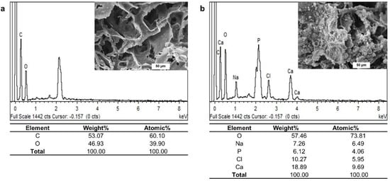 The EDX spectrum confirmed the existence of oxygen (O) and carbon (C) as the main components of the pristine PLA/PBAT scaffold (Figure 6a). The additional presence of calcium (Ca), sodium (Na), chlorine (Cl), and phosphorous (P) on the EDX spectrum of PLA/PBAT with PDA-assisted biomineralization revealed the successful formation of the CaP biomineralized layer on the outer surface of the PLA/PBAT scaffold (Figure 6b). The deposited biomineralized layer provided the Ca/P atomic ratio of 2.38.