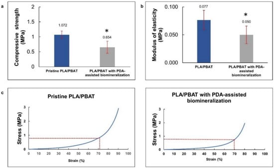 The average compressive stress (a) and average modulus of elasticity (b) of PLA/PBAT scaffold and PLA/PBAT scaffold with PDA-assisted biomineralization. The difference in number of asterisks represents statistical significance (p ≤ 0.05). The representative stress–strain curves for pristine PLA/PBAT scaffold and PLA/PBAT scaffold with PDA-assisted biomineralization are exhibited (c).