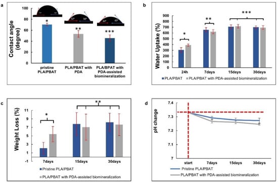 The in vitro degradation tests. The average water contact angles (a), the water uptake (%) (b), and the material weight loss (%) versus degradation time (c) of the PLA/PBAT scaffold with and without surface modification, and the pH alteration of the degradation medium (d). The vertical and horizontal red dashed lines represent the starting point of the investigating period and the initial pH of the soaking medium, respectively. The different numbers of asterisks indicate statistical significance (p ≤ 0.05).