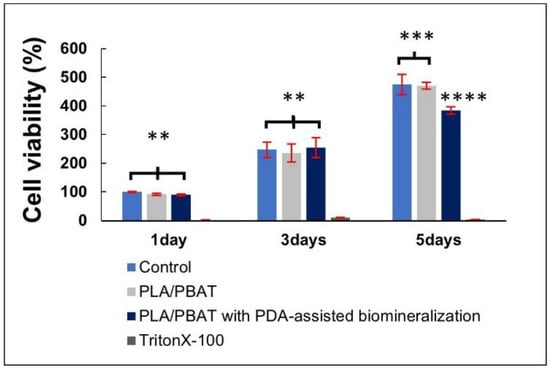 The excellent biocompatibility of the pristine PLA/PBAT porous scaffold and the biomineral coating material toward the human osteoblast-like cells (MG-63) was observed. The absence of the biological enhancement effect of the pristine PLA/PBAT scaffold toward the human osteoblast cells was confirmed, as reported in a previous study []. The remarkable inverse relationship between cell proliferation and cell differentiation could explain the significant reduction in MG-63 cell viability following the 5 days of cell culture in the extracted medium of PLA/PBAT with PDA-assisted biomineralization, compared to the group that was incubated in the extracted medium of pristine PLA/PBAT. According to the literature, the cell differentiation process starts with the continuous division of the precursor cells at the initial stage, while the terminal differentiation process usually coincides with the arrest of proliferation and permanent exit from the division cycle []. Therefore, the application of PDA-assisted biomineralization on the surface of the porous PLA/PBAT scaffold could result in an improvement in the osteogenicity of the inert PLA/PBAT scaffold.
