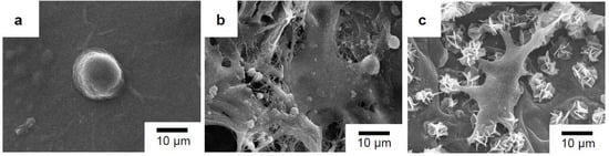 Generally, the osteogenic differentiation process is classified into three main stages, namely cell proliferation, extracellular matrix (ECM) formation, and matrix mineralization []. The adhesion of cells on the scaffold surface is the first critical step for the progression of cell proliferation []. The SEM images of the present study clearly exhibited the efficient attachment of human osteoblast-like cells (MG-63) on the surface of the porous PLA/PBAT scaffold coated with the biomineralized layer. The adhered cells on the surface of the PLA/PBAT scaffold with PDA-assisted biomineralization showed a significant alteration in cell morphology compared to the control. This finding indicated the enhancement effect of the biomineralized layer on osteoblast cells’ proliferation, which was related to the first stage of the osteogenic differentiation process.