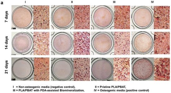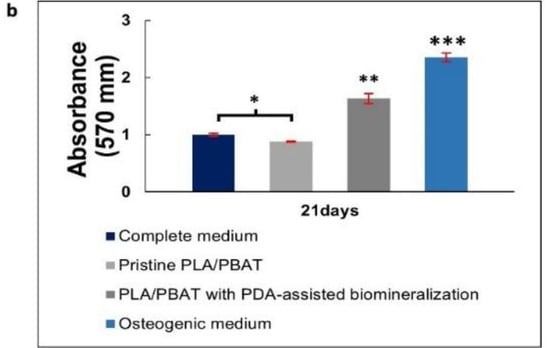The formation of the extracellular matrix’s mineralization is considered as a marker of the final stage of osteogenic differentiation. In the present study, Alizarin Red staining showed a significantly higher level of mineralization when the MG-63 cells were cultured in the extraction medium of the PLA/PBAT scaffold with PDA-assisted biomineralization. This finding clarified the positive effect of the biomineralized layer on the late stage of the osteogenic differentiation process.