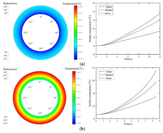 As shown in Figure 5a,b, there are no circumferential temperature differences in the UCS. The surface temperature increases along the radial direction, resulting in a gradual increase in the radial temperature difference. The highest temperature in the sliding time rises to 77.74 °C in Figure 5a, and the radial temperature difference extends from zero to 20.45 °C. As demonstrated in Figure 5c, the surface temperature in the contact sector is far greater than that in the non-contact zone, and thus a large temperate gradient shows up in both the radial and circumferential directions; the radial temperature shows a convex parabolic increase, whereas the circumferential temperature changes sinusoidally. Although the working parameters in Figure 5b,c are consistent, the contact pressure in the ICS is larger than that in the UCS, which leads to a higher heat flux. Thus, their highest temperatures are 143.36 °C and 310.80 °C, respectively.