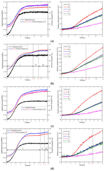 In the repeated experiments, the variation of friction torque was highly consistent. A maximum relative error of friction torque of only 6.8% appeared in test 4, thus confirming the reproducibility of the experiment. During the clutch sliding period, the variations of friction torque could be classified into three categories: linear, step and convex parabolic. As shown in Figure 7a,c, when the heat flux is small, the friction torque increases almost linearly after the applied pressure is stable; the larger the applied pressure, the greater the growth rate of friction torque, which is consistent with the simulation results. Exemplifying this, the growth rates are 2.57 N·m/s and 7.22 N·m/s, respectively. At the end of the sliding time, the radial temperature differences of both conditions are 24.54 °C and 47.35 °C, respectively, and the circumferential temperature differences are quite small, namely, 0.81 °C and 1.18 °C. Since the radial and circumferential temperature differences are within the safe range, the thermometric plate is still in the UCS.