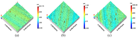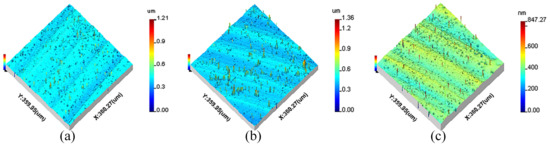 The original 3D surface topography of different spindle speeds: (a) n = 1300 r/min, (b) n = 1400 r/min, (c) n = 1500 r/min.