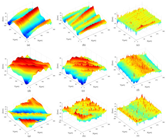 Figure 9 shows the 3D surface topographies reconstructed from the spatial frequency features obtained via CWT when the spindle speeds are 1300 r/min, 1400 r/min and 1500 r/min, respectively. In Figure 9a,d,g, the average amplitudes of low frequency are 6.1 nm, 10.3 nm and 14.5 nm with the spindle speed changing from 1300 r/min to 1500 r/min, and the wavelength is 179 μm in the X direction. The average amplitudes of middle frequency are 21.8 nm, 19.8 nm and 22.5 nm in Figure 9b,e,h, and the wavelength is 89 μm in the X direction. In Figure 9c,f,i, the average amplitudes of high frequency are 5.5 nm, 8.5 nm and 10.4 nm, and the wavelength is 36 μm in the X direction. The spatial middle-frequency feature (fx = 0.0112 μm−1) is closest to the original machined surface. This is consistent with the analysis results showing that the spatial middle-frequency feature is the main spatial frequency feature. The wavelengths and amplitudes of the middle frequencies are almost invariable with the changing of the spindle speed. With the cutting depth and feed rate unchanged, the 3D surface topographies of the spatial low-frequency features have less information. The spatial high-frequency features reflect information about the spatial frequency features with a larger amplitude. The reconstructed 3D surface topographies of the middle and low frequency features with the spindle speed n = 1400 r/min are relatively flat. Combined with the 2D PSD results of the machined surface, the machined surface with n = 1400 r/min has the better surface quality.