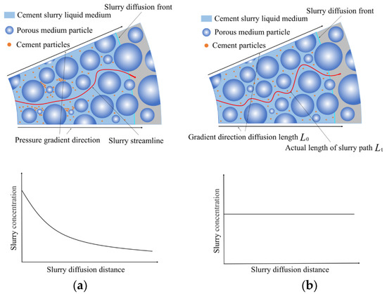 In the process of grouting, the filtration effect of porous media on slurry particles is spatial non-uniformity [26,27,28,29]. As shown in Figure 1a, this characteristic will increase the penetration resistance of slurry in porous media, leading to the acceleration of pressure attenuation of slurry in porous media. To introduce the filtration effect into this study, a simplified model is proposed, as shown in Figure 1b. The actual length of the seepage path of the slurry in the grouting process is , and the effective diffusion distance is . It is assumed that the cement particles are uniformly suspended in the injected media, and the subsequent grouting will pass through the porous media particles and suspended cement particles to reach the non-grouting area. The advantage of this model is that the resistance caused by the filtration effect in porous media is included in the increment of tortuosity through the homogenization hypothesis, which is convenient to be introduced into this study. The actual porosity of the grout passing through the grouted area is smaller than that of the original porous media, so the tortuosity of the grouting process is larger than that of the original porous media, which replaces the blocking effect of the grout particle filtration effect on the subsequent grout injection.