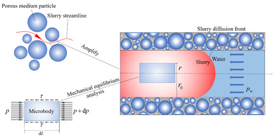The flow of slurry in the porous media is regarded as the laminar flow of the capillary. Take a circular tube with radius , and select the stress state of a microfluidic column with radius and length , as shown in Figure 3. Without considering the gravity of the slurry, the equation of the force balance in the horizontal direction of the micro-fluid column is as follows [18,36]: