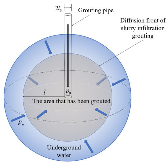 The theoretical model of spherical penetration and diffusion of cement slurry in porous media is shown in Figure 4, in which is the grouting pipe diameter, is the slurry diffusion radius, is grouting pressure, and is the groundwater pressure.