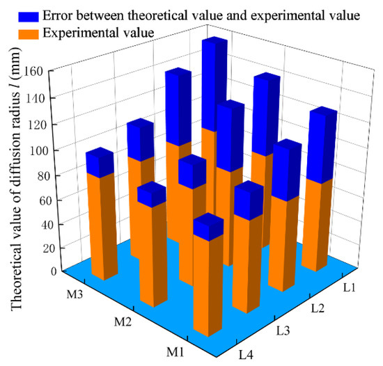 Comparison between theoretical value and the measured value of the diffusion radius under different parameters (unit: mm).