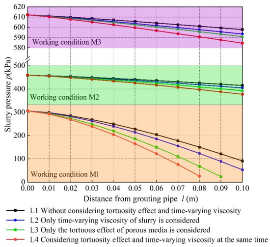 Therefore, for working conditions M2 and M3, the main control factors of slurry pressure attenuation are different under the same working conditions and different grouting times: when the grouting time is short, the tortuous effect of the porous media is the main control factor of the slurry pressure attenuation, which is mainly reflected by the pressure attenuation predicted by theory L3 being more obvious than that predicted by theory L2. When the grouting time is long, the pressure attenuation of the grout is more sensitive to the time-varying viscosity of the grout, which is reflected by the pressure attenuation predicted by theory L2 being more significant than that predicted by theory L3.