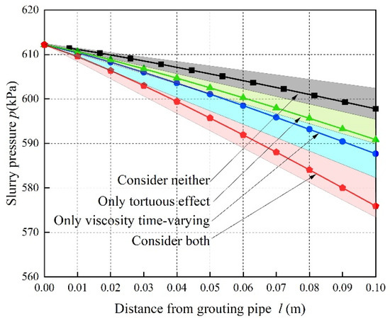 From Figure 7, it can be seen that the pressure attenuation rate predicted by only considering the time-varying viscosity of the slurry is 70.09% faster than that predicted by not considering the time-varying viscosity of the slurry and the tortuosity of the porous media, while that predicted by only considering the tortuosity of the porous media is 48.48% faster than that predicted by not considering the time-varying viscosity of the slurry, which is only 69.17% of that for considering the time-varying viscosity of the slurry. Therefore, it is not difficult to see that for the long grouting time, the time-varying viscosity of the power-law grout dominates the spatial attenuation of the grouting pressure.