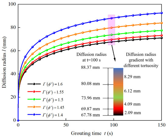 It can be seen from Figure 8 that at the initial stage of grouting, the diffusion rate of the slurry is relatively fast, and gradually slows down with the grouting time. This is because with the increase in grouting time, the viscosity of the slurry increases, the resistance of the subsequent grouting slurry increases, and the diffusion rate of the slurry slows down. The greater the tortuosity of the grouting process, the smaller the diffusion radius of the slurry at the same time; the equal gradient increases the tortuosity; and the decreasing gradient of the diffusion radius at the same time shows a decreasing trend. This is because the greater the tortuosity, the lower the porosity of the injected soil layer, the more complex the pore structure, the greater the resistance of the gravel layer to the slurry, and the smaller the pore diameter, making it more difficult for the slurry to be injected into the porous media. Therefore, the narrowing gradient of the diffusion radius shows a decreasing trend.