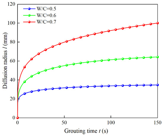 It can be seen from Figure 9 that when the water–cement ratio is 0.5 and 0.6, the diffusion rate decays rapidly, and the diffusion radius tends to become stable quickly. When the water–cement ratio is 0.7, the diffusion rate decays slowly, and the diffusion radius of the grout still develops significantly in the later stage of grouting. Combined with the above theoretical analysis, the water–cement ratio has two influences on grouting. First, the injection of slurry particles changes the porosity of the gravel soil, resulting in the actual tortuosity of the grouting process; second, the constitutive parameters of the slurry with different water–cement ratios are different. For the slurry with a small water–cement ratio, its initial viscosity and time-varying parameters are large, so it is easy to reach the diffusion radius threshold. However, the slurry with a higher water–cement ratio is easier to inject into the injected soil layer. Therefore, the water–cement ratio of the slurry is closely related to the viscosity, and the corresponding constitutive parameters also have an important influence on the effect of penetration grouting.