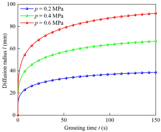 Cement slurry with a water–cement ratio of 0.6 is injected into the soil layer with a natural porosity of 0.45. The porosity of the grouting process is 0.2937 from Equation (5), and the tortuosity of the grouting process is 1.5023 from Equation (6). The grouting pressures are 0.2 MPa, 0.4 MPa, and 0.6 MPa, respectively. Taking the parameters into Equation (35), the variation law of slurry diffusion radius with time under different grouting pressures is shown in Figure 10.