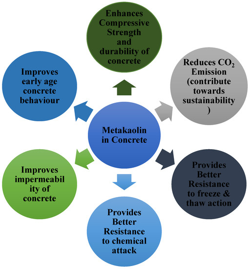 MK is an alternative to cement that is manufactured by calcining kaolin clays at elevated temperatures ranging from 700 °C to 900 °C. As a cement replacement in concrete structures, MK has been employed as a 10% to 50% replacement, depending on the specific application [4,5,6,7]. It has been shown that MK enhances the mechanical and durability properties when used in place of Portland cement [8,9,10]. The pozzolanic reaction, MK aggregate’s fineness, and the accelerated cement hydration all contribute to an increase in concrete’s compressive strength (fc’) during the early curing phases [11]. Additionally, cement manufacture generates a substantial amount of carbon dioxide (CO2) emissions; this new trend of replacing metakaolin for cement in concrete is part of a comprehensive approach to environmental sustainability. Addition of MK in concrete has various advantages as depicted in Figure 1.