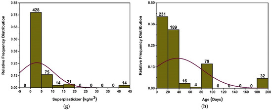 Compressive strength parameters’ relative frequency distribution; (a) cement, (b) fine aggregate, (c) coarse aggregate, (d) water, (e) silica fume, (f) metakaolin, (g) superplasticizer, and (h) age.