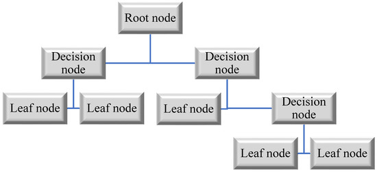 DT modelling includes two phases: tree creation and tree pruning [67]. Stage one starts with DT’s root node being identified as the independent variables with the highest performance gain. Following that, according to root values, the training dataset is partitioned into subsets and sub-nodes are created. When the input variables are discrete, a sub-node of the tree is constructed for each conceivable value, whereas in some circumstances, the threshold-finding step results in the generation of two sub-nodes [68]. Following that, each sub-gain node’s share is calculated, and the technique is recurring till all samples in a certain node are classified as belonging to the same class. They are then referred to as “leaf nodes,” and their values are designated as the values of the classes they belong to. A flow chart of DT is shown in Figure 4.