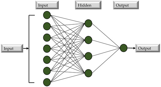 A multilayer perceptron neural network (MLPNN), a network-based DM computing approach, is employed in this research with individual base learner and ensemble base learner methods to model and forecast MK concrete. An ANN program mimics the structure of a biological nervous system’s neurons [69]. Parallel linkages provide the basis of ANNs. In order to transmit the weighted inputs from neurons, these cells use an activation function to transmit the weighted outputs. It is possible to have one or more multi-layers in these activities. Use of the multilayer perceptron network is widespread in brain activity. The perceptual response is created among the number of input parameters and the number of output parameters. There are three types of layers in a network: input, hidden, and output. Between the input and output layers, there is a hidden layer that may have a huge network of hidden layers. The perceptron can handle all of its issues with a single layer, but it is more efficient and helpful to have several hidden layers [70]. Figure 5 depicts a typical neural network design. With the exception of neurons in the input layer, all neurons in a layer perform linear addition and bias computations. Non-linear functions are then calculated in the hidden layers by neutrons A sigmoid function is a word used to describe a non-linear function [71]. This research paper models ANNs using a feed-forward multi-layer perceptron (MLPNN) network. To discover the highest-performing MLPNN, hidden layers and neuron pairs of varied numbers are meticulously selected [72]. In the hidden layer, the link between input and output variables may also be determined using a linear activation function and a nonlinear transit function. In addition, the data extracted from the published literature are separated into training and testing sets. This is conducted to reduce the influence of data overfitting, since overfitting is an intractable issue in machine learning. Randomly, 80 percent of the data is used for training the models and 20 percent for testing the trained models, as recommended by the literature [73].