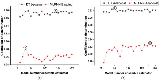 Models of the tuning parameters that are employed in the ensemble methods might consist of (i) factors connected with the optimum model learners’ number and (ii) rate of learning and other attributes that have a significant influence on ensemble algorithms. In this research, twenty sub-models were generated for each ensemble base learner. The component sub-models ranged in size from 10 to 200, and the optimum constructs were selected on the basis of the large values of determination coefficient. Figure 6 illustrates the link between performance of ensemble model and the number of component sub-models. As shown in Figure 6a,b, the assembling model with bagging and boosting yields a significant determination coefficient in the estimation terms. As demonstrated in Figure 6a, the 140th sub-model of DT with bagging as an ensemble of other sub-models provides a stronger relationship than the other sub-models of DT with bagging. Similarly, the 30th sub-model of MLPNN with bagging provides a significant higher correlation coefficient as compared to MLPNN bagging other sub-models. Similarly, as depicted in Figure 6b, the 50th DT AdaBoost and the 180th MLPNN AdaBoost sub-model provide the best results when compared to their other sub-models. Preliminary analysis indicates that the usage of ensemble modelling improves the efficiency of both models.