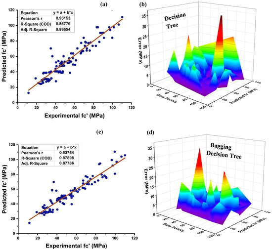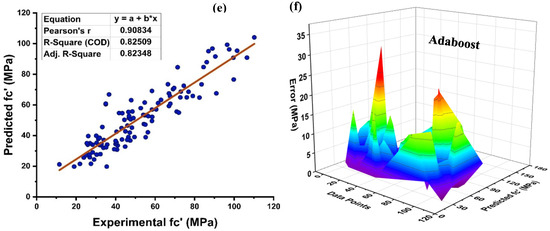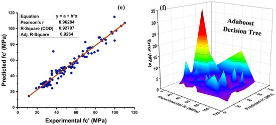 As seen in Figure 8, the DT is modelled using various ensemble techniques including bagging and boosting. The actual prediction from individual base learner DT produces a high relationship with predicted values having a R2 = 0.868, as seen in Figure 8a. Figure 8b depicts the error distribution of an individual DT model. Figure 8b indicates that the testing set has an average inaccuracy value of 5.79 MPa. In addition, 82.88 percent of the data exhibit error below 10 MPa, and 11.7% of the data exhibit error between 10–15 MPa. In contrast, each domain of 15–20 MPa, 20–25 MPa, and 35–40 MPa contains 1.8 percent data error, with a maximum and minimum error of 35.3 MPa and 0.085 MPa, respectively, as illustrated in Figure 8b. Individually, DT provide accurate predictions; but, if the DT is an ensemble of several methodologies, it yields a more precise outcome, as seen in Figure 8c–f. Bagging ensemble yields a conclusive and favourable result with R2 = 0.879 and minimal testing data error. The data indicate an inaccuracy of 84.685% below 10 MPa, 9% between 10 and 15 MPa, and 3.6% between 15 and20 MPa. As shown in Figure 8d, only 1.8% of the data fall between 20 and 25 MPa and 0.9% between 30 and 35 MPa, with a maximum and minimum error of about 33.06 MPa 0.029 MPa, respectively. Similar to individual DT and bagging DT algorithms, boosting with AdaBoost produces models with a significant correlation. As seen in Figure 8e–f, this is because of the influence that a strong learner has on the aspect of prediction. A DT AdaBoost ensemble model has a R2 equal to 0.924. The error distribution is minimised by applying AdaBoost with a DT, with an average error of 4.12 MPa, a maximum and minimum error of 34.578 MPa, and 0.065 MPa, respectively. Approximately 92.79%of the data is below 10 MPa, with 6.3% between 10 and 15 MPa and 0.9% between 30 and 35 MPa. Table 3 presents the statistical information pertaining to DT with bagging and boosting ensemble learners.