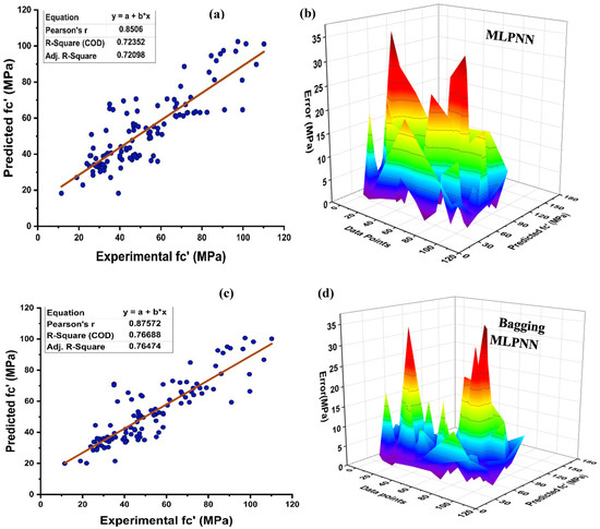 In the field of ML and AI, neural networks fall under the rubric of supervised learning, and its implementation yields a rigid correlation between prediction and target response. As illustrated in Figure 9, MLPNN is also modelled utilising ensemble learner’s methods, similar to the DT. Figure 9a depicts the actual projection of MK concrete with R2 = 0.724 with its error distribution as seen in Figure 9b. MLPNN error distribution indicates that a test set has an average error of 8.70 MPa, with lowest and highest errors of 0.044 MPa and 35.15 MPa, respectively. However, MLPNN ensemble model reduces the distribution of average error with a rise in the R2 of around 0.767 for bagging and 0.825 for boosting, respectively. The average error for MLPNN-bagging and AdaBoost boosting is 7.29 MPa and 7.05 MPa, respectively, as seen in Figure 9c–f. In addition, a major portion of testing set error is below 10 MPa, with 72.97%, 77.48%, and 74.77% of the data, respectively, for the individual, bagging, and AdaBoost MLPNN models. These ensemble-model outputs also demonstrate a rise in R2 by exhibiting less inaccuracy than the real output. Table 4 illustrates the statistical evaluation of testing data via MLPNN ensemble modelling.