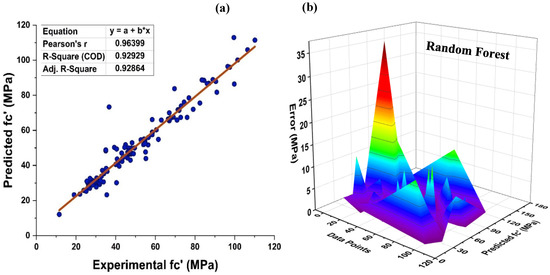 Within the framework of the ensemble ML approach, RF represents a hybrid type of bagging and random feature selection, which is a technique for the production of prediction models that is both efficient and easy to use. Figure 10 depicts the prediction accuracy of the RF method for MK concrete. As it is an ensemble model, it exhibits a stubborn R2 = 0.929 correlation with the target values. In addition, the RF model’s prediction may also be tested using an error distribution with an average error of 3.52 MPa. In addition, 90.99 percent of the results indicate that the error falls under 10 MPa, demonstrating the precision of the non-linear estimation of the normal concrete’s strength as shown in Figure 10b.