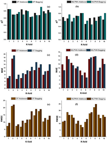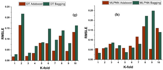 - Statistical measures using MAE, RMSE, RMSLE, and R2 were also performed. Ensemble learner DT bagging and boosting depicts a smaller error of about 4%, and 29% for MAE, 8% and 29% for RMSE, 5% and 27% for RMSLE, respectively, when compared to the individual DT model. Similarly, enhancements of 16% and 19% in MAE, 12% and 21% in RMSE, and 16% and 20% in RMSLE were observed for MLPNN bagging and AdaBoost models, respectively, when compared to the individual base learner DT model;