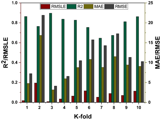 The model’s required accuracy is essential to its assessment. To verify the accuracy of prediction models, this validation is necessary. The K fold validation test is employed to validate the correctness of data using data shuffles. Randomly sampling the training data set introduces bias, hence this strategy is used to reduce it. This technique divides the samples evenly into 10 subgroups of the experimental data. One of the 10 subsets is utilised for validation, while the other nine are employed to shape up the strong learner. The procedure is done 10 times and then averaged. In general, it is commonly accepted that the 10-fold cross validation approach accurately reflects the model’s generalisation and dependability [79]. The validation test of all the ensemble models is presented in Figure 11 and Figure 12. All models exhibit a moderate to high correlational link. In addition, the outcomes of cross-validation may be evaluated based on various errors, such as R2, MAE, RMSE, and RMSLE, as shown in Figure 11 for DT and MLPNN and Figure 12 for RF. It displays the validation representation in each 10-fold. Although variations were noticed, it retained a high degree of precision, as seen in Figure 11 and Figure 12. For example, the lowest and highest R2 values for all models are between 0.46 and 0.65 and 0.81 and 0.91, respectively. As demonstrated in Figure 11c–h for DT and MLPNN, MAE, RMSE, and RMSLE are also used to evaluate the accuracy of models with respect to cross-validation. Figure 11c depicts the average MAE value for DT with ensemble bagging and ensemble boosting using 10-fold validation as 11.97 MPa and 9.0 MPa, respectively. Figure 11e reveals that the RMSE offers an average error of about 14.6 MPa and 11.84 MPa for ensemble bagging and ensemble boosting using AdaBoost, respectively. Figure 11g displays RMSLE average errors of 0.106 MPa and 0.07 MPa for DT bagging and boosting, respectively. Figure 11d–f shows that the average MAE, RMSE, and RMSLE for the MLPNN bagging model are 11.06 MPa, 14.92 MPa, and 0.1 MPa, respectively. For the k fold validation of the MLPNN AdaBoost model, values of 12.03 MPa, 15.07 MPa, and 0.08 MPa were found. This demonstrates the precision of models using K-fold cross validation. Figure 12 demonstrates strong association for modified learner model with decreased error for MAE, RMSE, and RMSLE, with average errors of 8.94 MPa, 11.02 MPa, and 0.07 MPa, respectively.