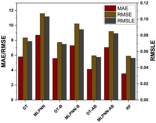 - RF shows improvements of 60%, 49%, and 50% in MAE, RMSE, and RMSLE when compared to the MLPNN individual model. Similarly, improvements of 39%, 29%, and 29% for the RF model, in MAE, RMSE and RMSLE, were observed in comparison to DT individual model;