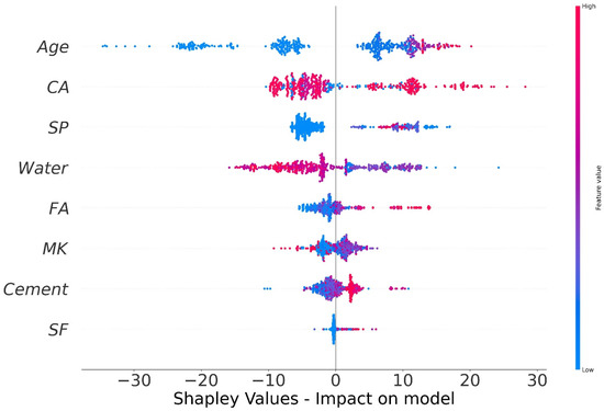 - Age has the greatest impact on calculating MK concrete fc’, followed by coarse aggregate and superplasticizer, according to the SHAP assessment. However, silica fume has the least impact on the fc’ of MK concrete. SHAP dependency feature graphs can illustrate the relationship between input parameters for various ranges;