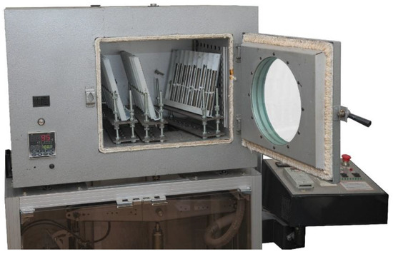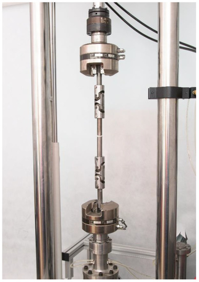 The adhesive joints were tested for axial tensile strength, which corresponds to pulling straight, in-plane, and away from the adhesive bond. For this purpose, the joints were fixed in the clamps of the testing machine (Figure 3) using U-joint grips and then pulled at a constant speed of 4 mm/min while recording the time, deformation and value of the tensile force. The tests were carried out in two series for each of the prepared combinations, i.e., at an ambient temperature of 20 °C and, using the heating chamber of the testing machine, at an elevated temperature (50 °C for the joints made with E57/PAC adhesive and 70 °C for Hysol 9492). At the end of each test run, the failure mode of the individual joints was recorded according to the EN ISO 10365:2022 standard (Adhesives—Designation of main failure patterns) [20].