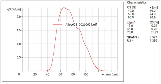 Inconel 625 powder was purchased from Praxair Surface Technologies Inc (Indianapolis, IN, USA) (chemical composition shown in Table 1). The powder was manufactured through the gas atomization method. When characterizing the powder, the results for particle distribution, measured using a Retsch Camsizer X2 (Haan, Germany), showed that 10% of the powder measures less than 55.7 µm in diameter, 50% less than 75.9 µm in diameter, and 90% less than 101.1 µm in diameter as shown in Figure 1. Flowability and apparent density respectively resulted in 2.91 g/s and 4.16 g/cm3.