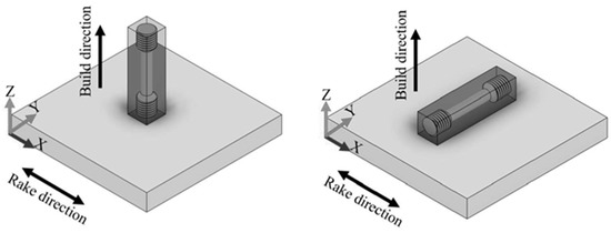 Tensile coupons were machined from the additively manufactured parts following ASTM E8 Standard Test Methods for Tension Testing of Metallic Materials. Vertical and horizontal coupons were created, considering their build direction, as shown in Figure 2, in order to compare their mechanical performance by applying a uniaxial monotonic tensile load at a strain rate of 0.179 mm/min to each specimen. The specimen dimensions were 6 mm in diameter and 10 mm in length. Five tensile specimens per variant were tested; results show the average values of each variant and the standard deviation (SD).