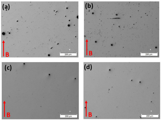 As-polished optical micrographs. (a) 50 μm AB; (b) 100 μm AB; (c) 50 μm HT; and (d) 100 μm HT. B denotes the build direction.